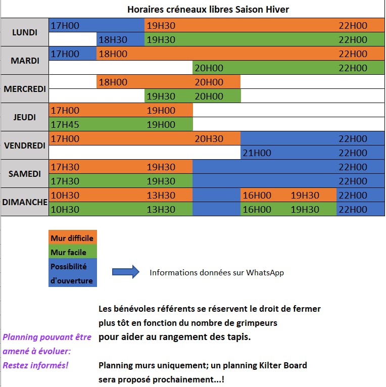 Mise à jour du planning ; certaines modifications pourront être apportées ( pour les adhérents, tenez-vous informés sur whatsApp), ou facebook, ou un petit message (briancon.escalade@gmail.com)